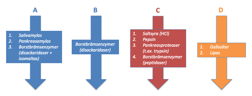 Vilken bild (A-D) visar vad som behövs för att spjälka kolhydrater i form av polysackarider?